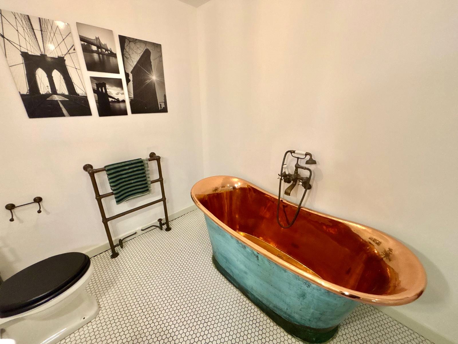 The principal bedroom is a luxurious retreat, boasting double patio doors that open onto the private rear terrace. It is further enhanced by a spacious dressing room and an indulgent en-suite bathroom, complete with a walk-in shower, twin wash basins, low-level WC, and a freestanding brass bath.