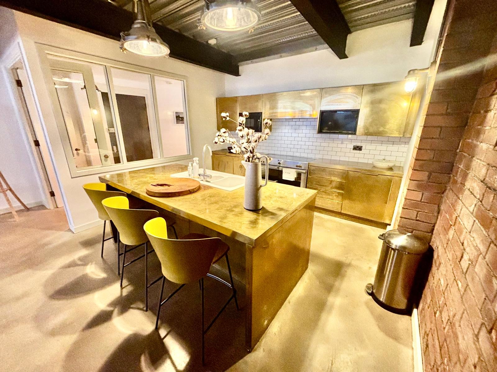 The kitchen is a true statement in design, featuring a bespoke brass-clad finish with an array of wall and base units, complemented by a striking central island with breakfast bar. Fully equipped for modern living, it includes an integrated electric oven, hob, extractor, and a range of high-specification appliances.