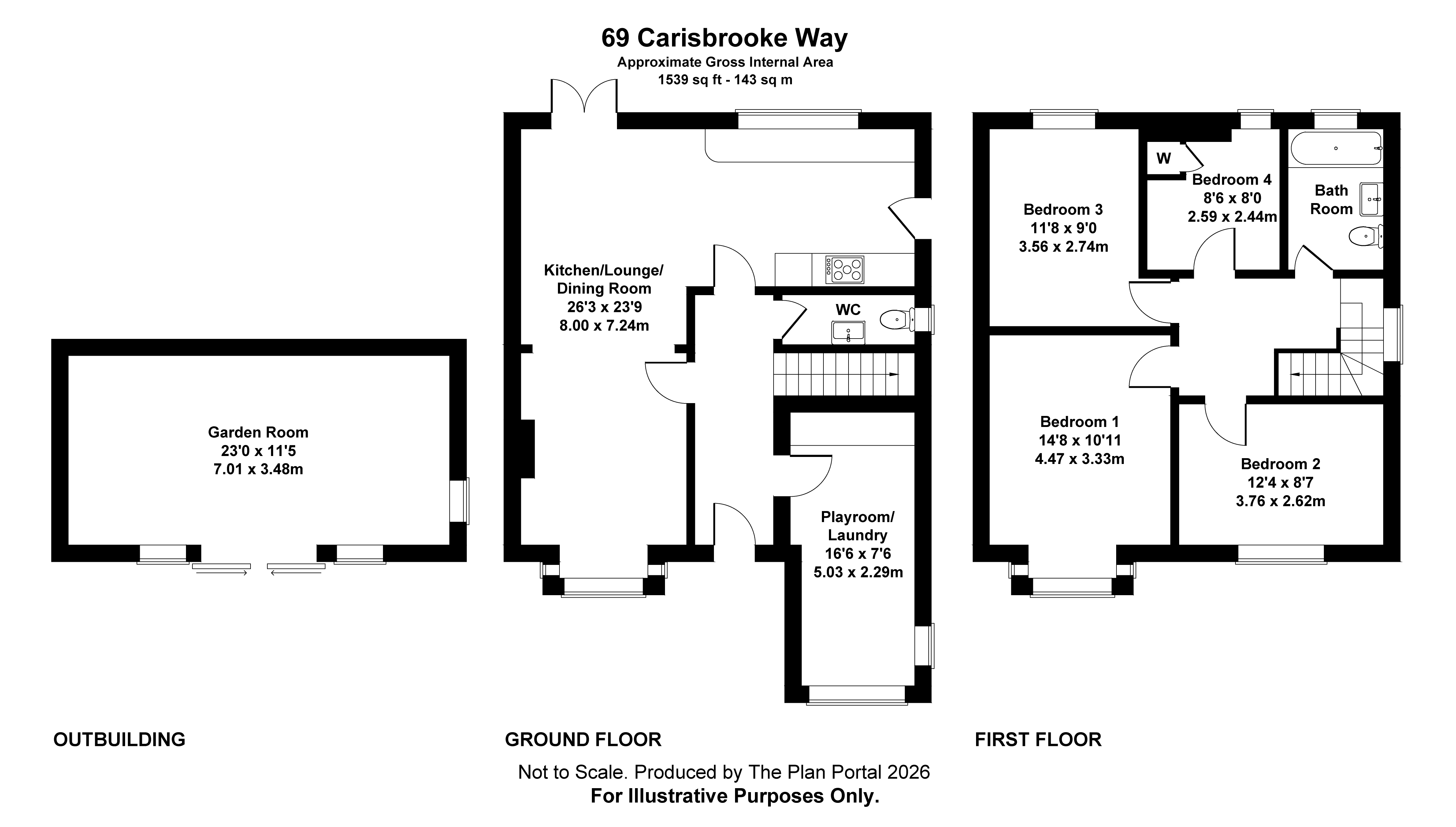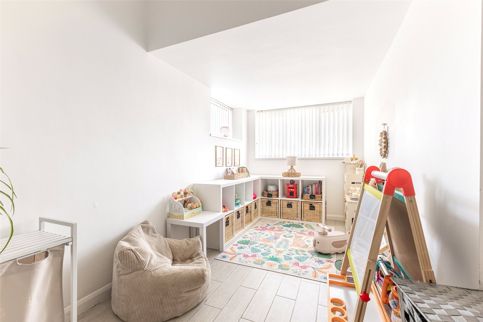 Playroom/Laundry Room 166 x 76 Aspect to front and opaque window to side, quality tiled flooring, TV point, radiator, range of cabinets and oak worktops to one side with space and plumbing for automatic washing machine and condensing tumble drier.