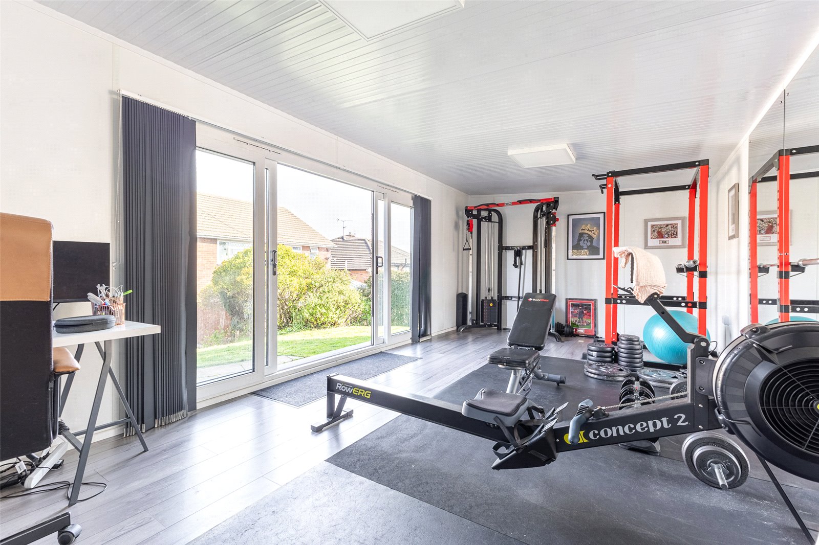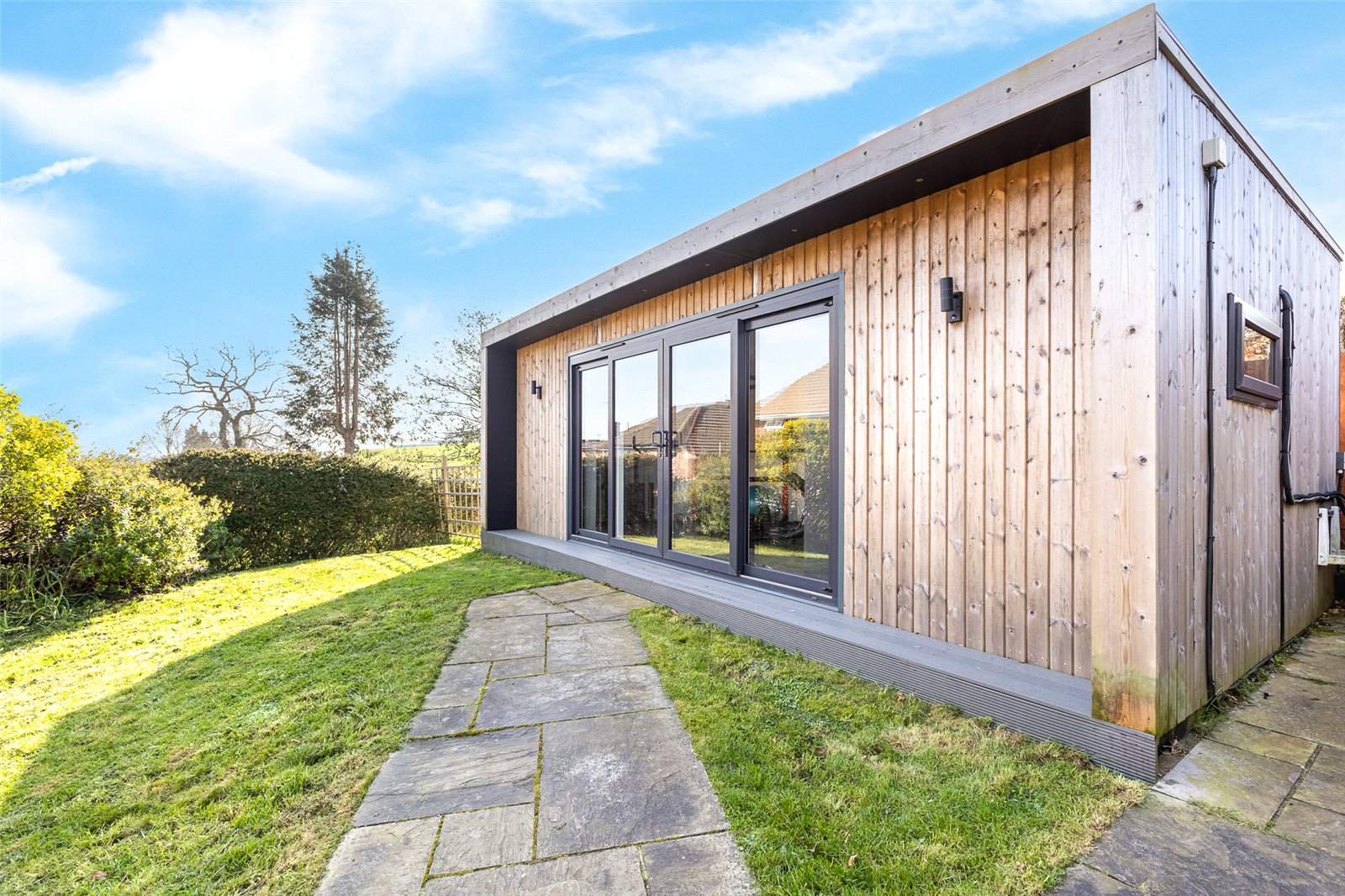 Garden Room 230 x 115 Contemporary timber cladded garden room with full height windows and sliding doors, outdoor mounted wall lights and downlighters, hardwired broadband, additional window to side, power points and lighting, wood grain effect flooring. Air conditioning unit.