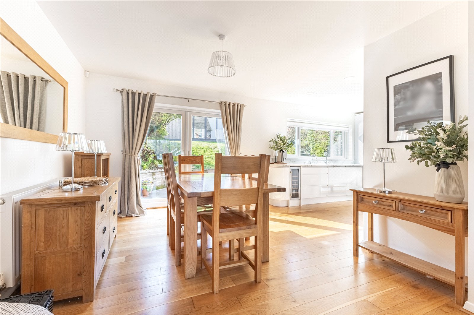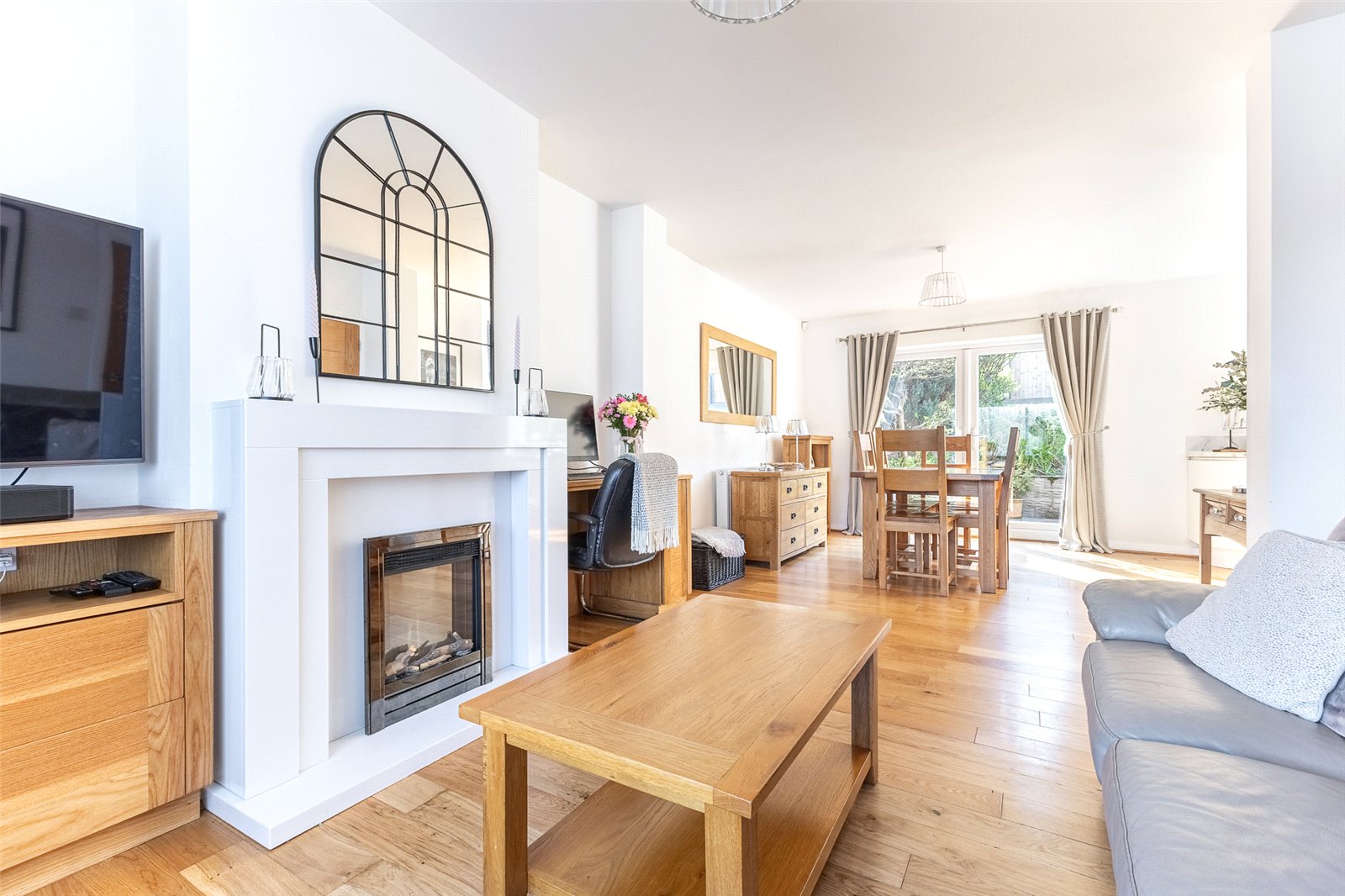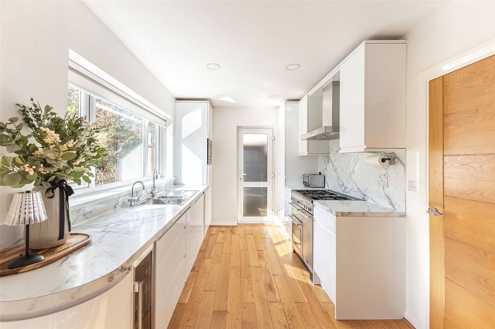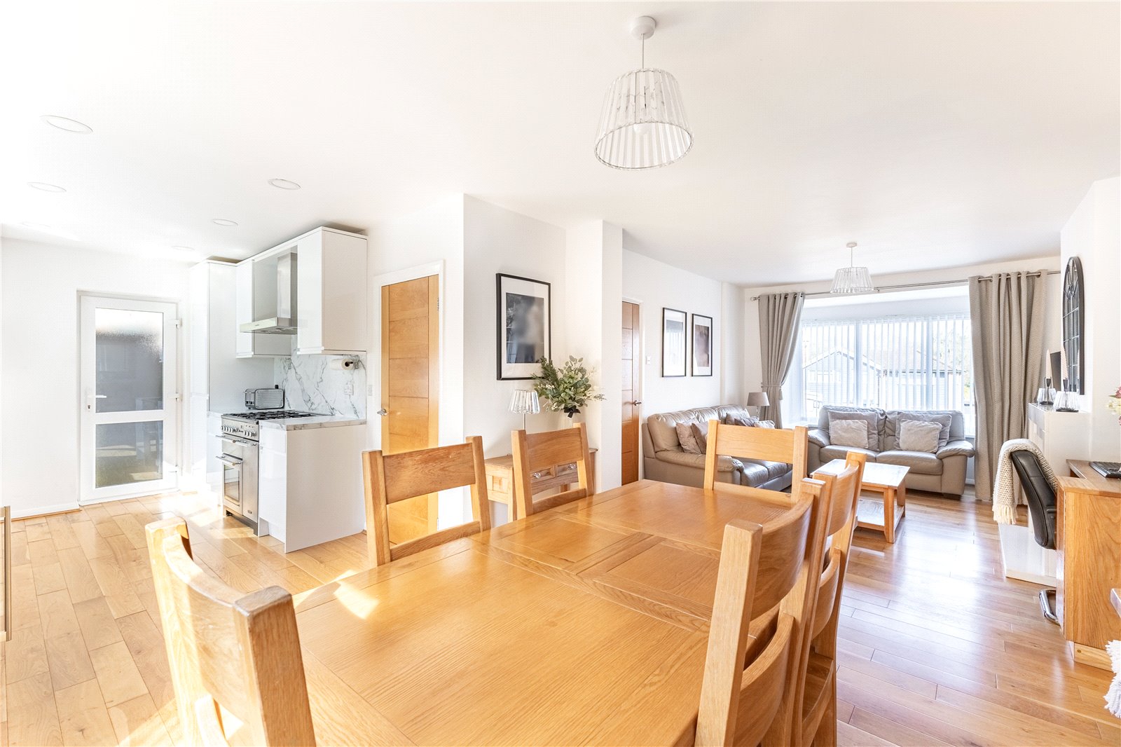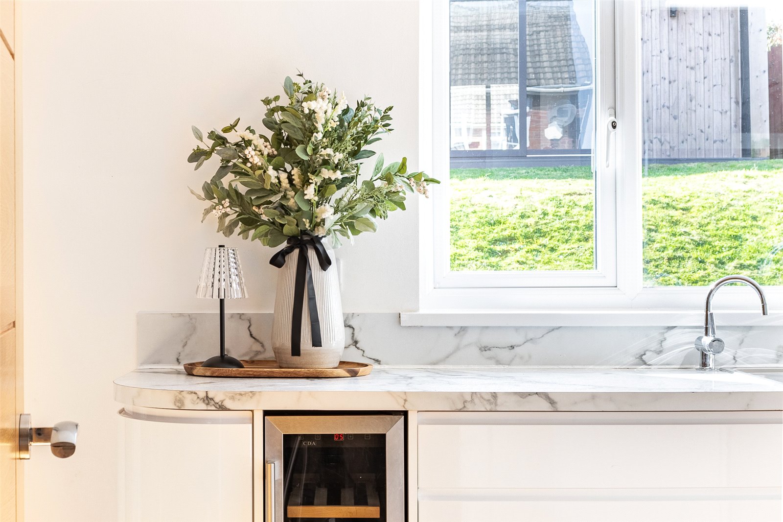 Lounge/Diner/Kitchen 263 x 239 L Shaped and into bay Beautiful and light open plan living space, comprising of a lounge with square bay window overlooking the large keyblock driveway, quality engineered wood flooring, contemporary stone fire surround with spotlights and electric fire, bespoke fitted desk and TV unit, radiator, opening to the dining area with radiator and ample space for a large family dining table, glazed French doors onto the rear patio. Modern kitchen appointed along two sides in white gloss fronted units beneath quality worktop surfaces, inset stainless steel one and a half bowl sink and drainer with mixer tap and Insinkerator hot and cold filtered tap, space for a range cooker, stainless steel cooker hood, integrated microwave/oven, integrated fridge and freezer, integrated dishwasher and wine cooler, matching range of eye level units, continuation of the engineered wood flooring, large inset spotlights, window overlooking the well-manicured rear garden with day/night roller blind, opaque glazed door to the side.