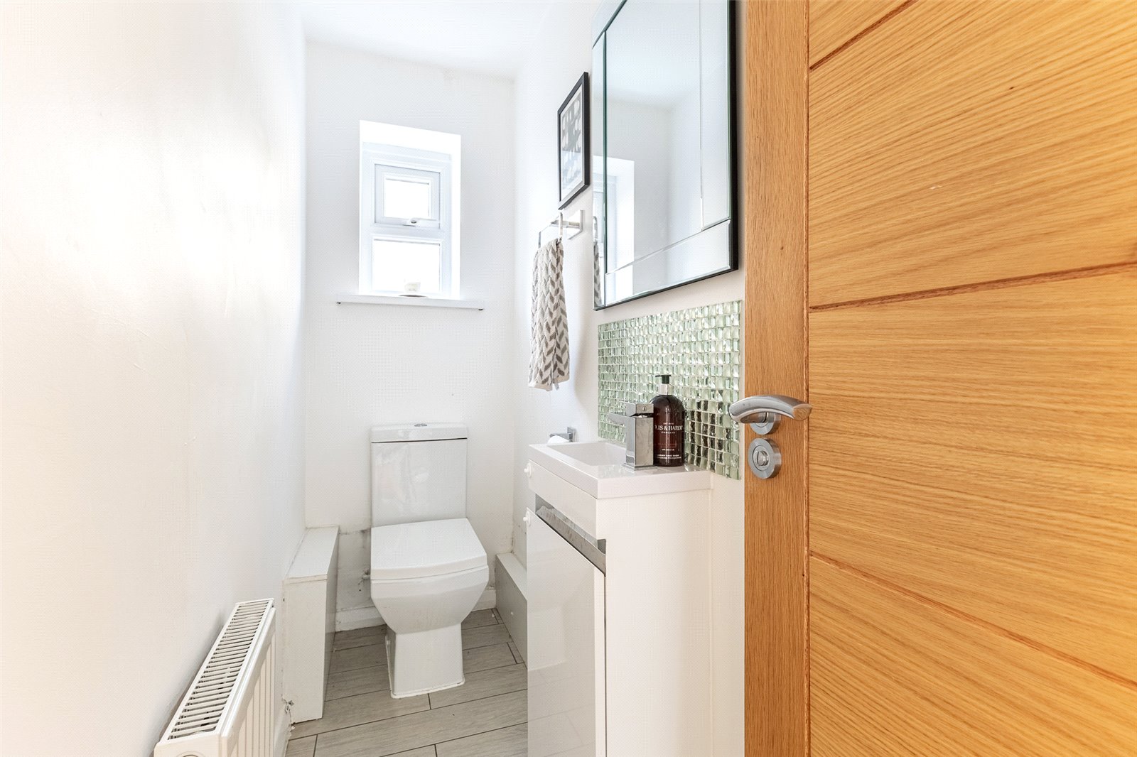 Cloakroom Modern white suite comprising low level WC with push button cistern, wash hand basin with mixer tap and storage cabinet below with tiled splashback, opaque window to side, radiator, quality tiled flooring.