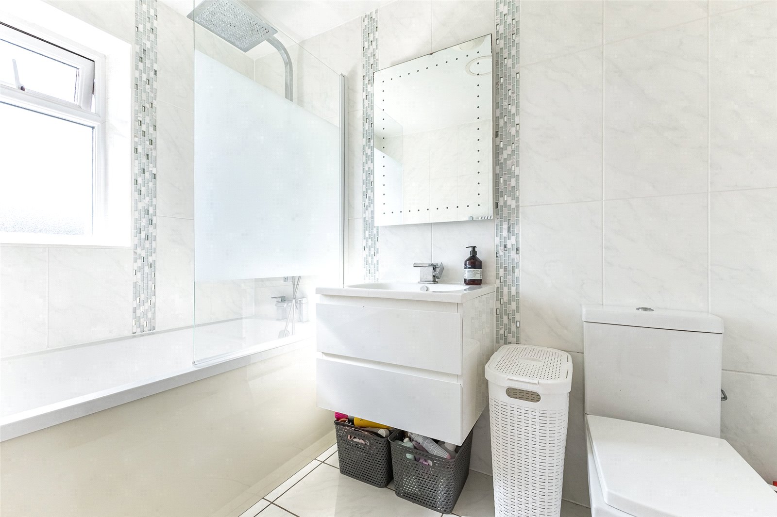 Family Bathroom Comprising low level WC with push button cistern, wash hand basin with mixer tap and storage below, Bluetooth mirror with LED lighting and heated demister pads, panelled bath with glazed shower screen and a rainfall style shower and jets. Comprehensively tiled walls and flooring, opaque window to the rear, chrome heated towel rail.