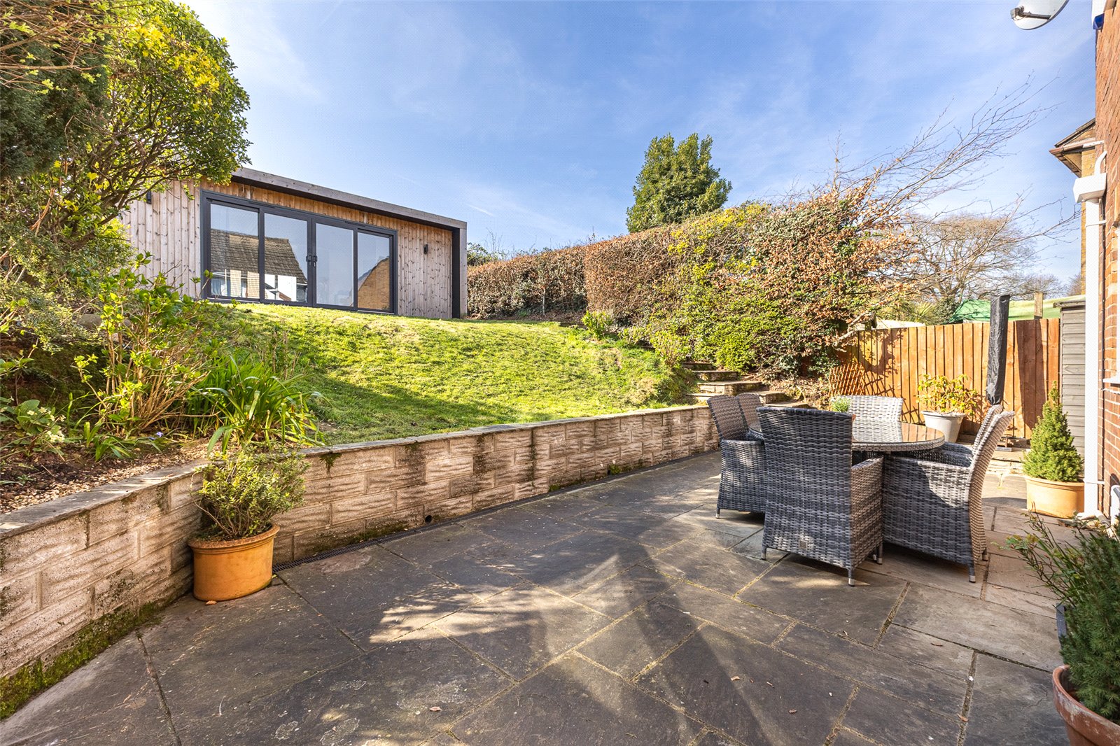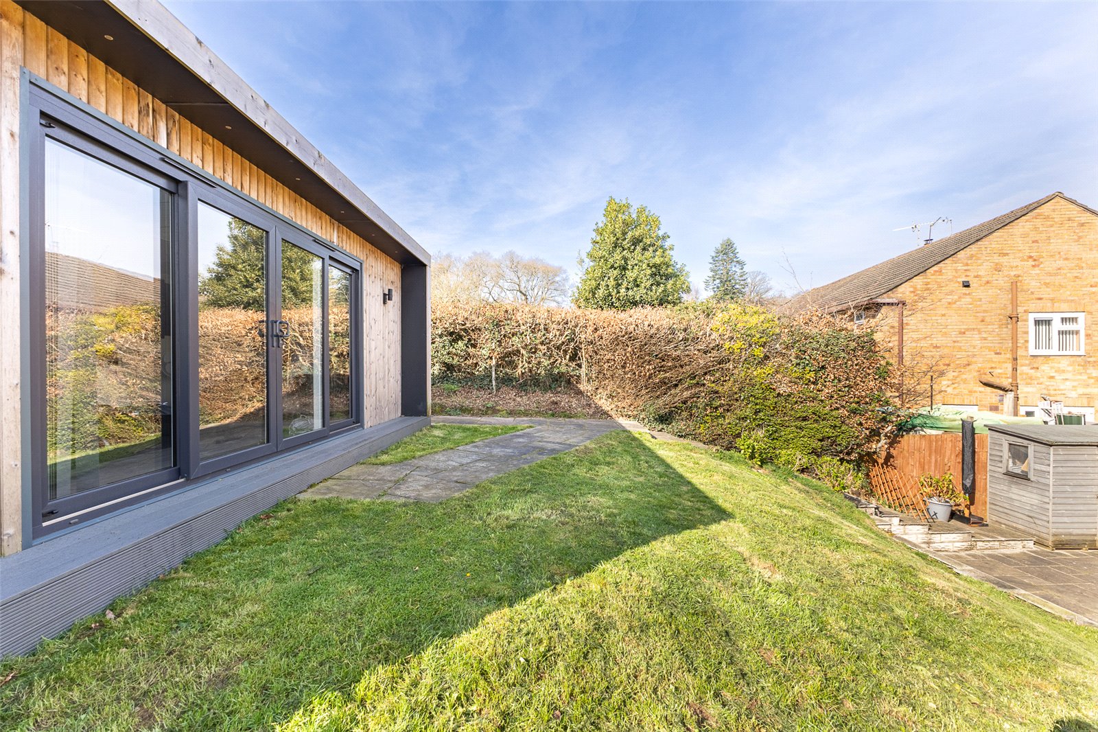 Rear Garden South facing rear garden with paved patio area stepping up to a good section of lawn enclosed with timber lap fencing and hedgerow, paved pathway continuing to the side with a timber garden shed and gates leading to the front driveway.