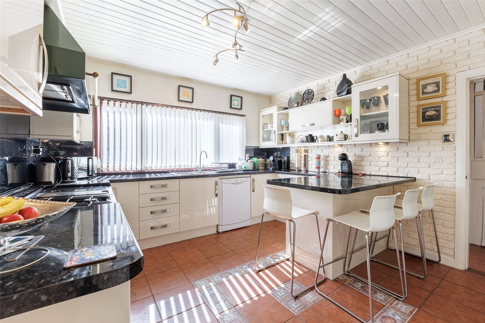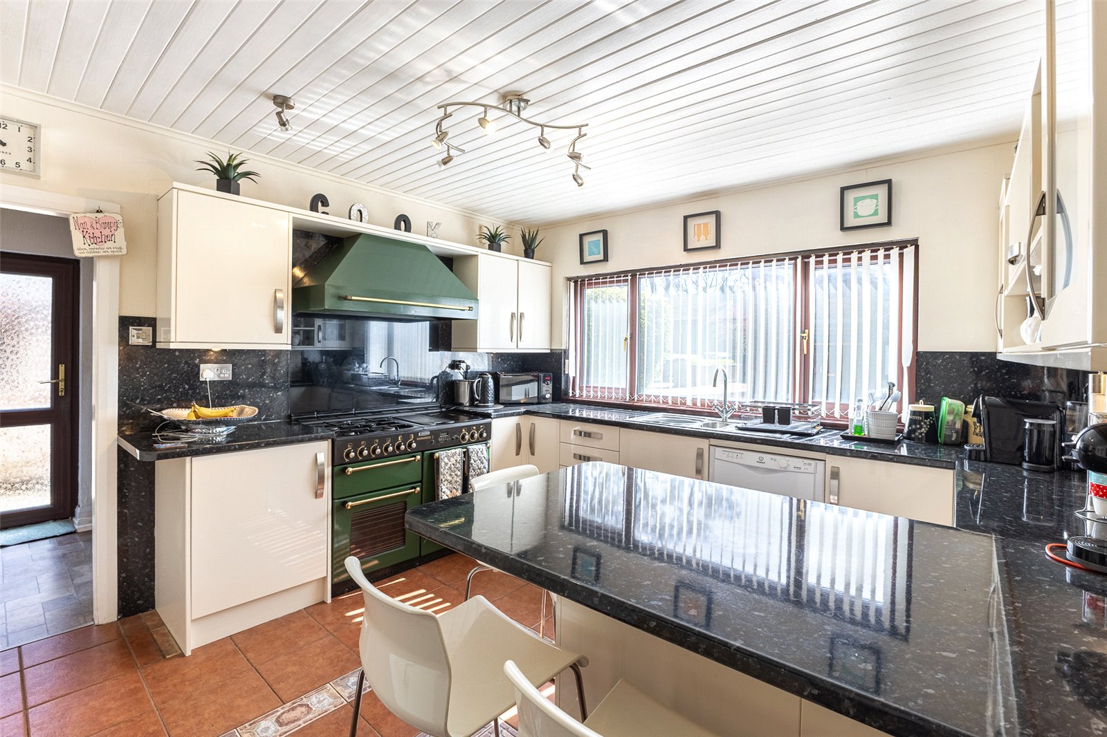 Kitchen 12'4" (3.76m) x 11'8" (3.56m) Well fitted along three sides beneath round nosed worktop surfaces, Rangemaster 110 four ring gas hob with hotplate and warmer plate, oven below, double width circulating fan above, range of matching base and eye level wall cupboards with pelmets and borders, inset 1.5 bowl stainless steel sink with drainer and mixer tap, plumbed for dishwasher, peninsular breakfasting bar with base cupboards, tiled flooring with central border, panelled radiator.