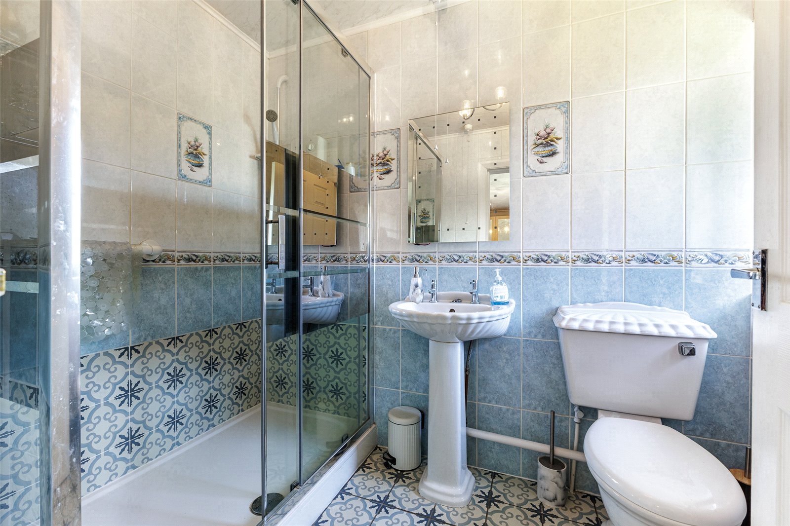 En Suite Low level WC, pedestal wash hand basin, double width shower cubicle with shower screen panels, ceramic wall tiling, panelled radiator, Velux window.