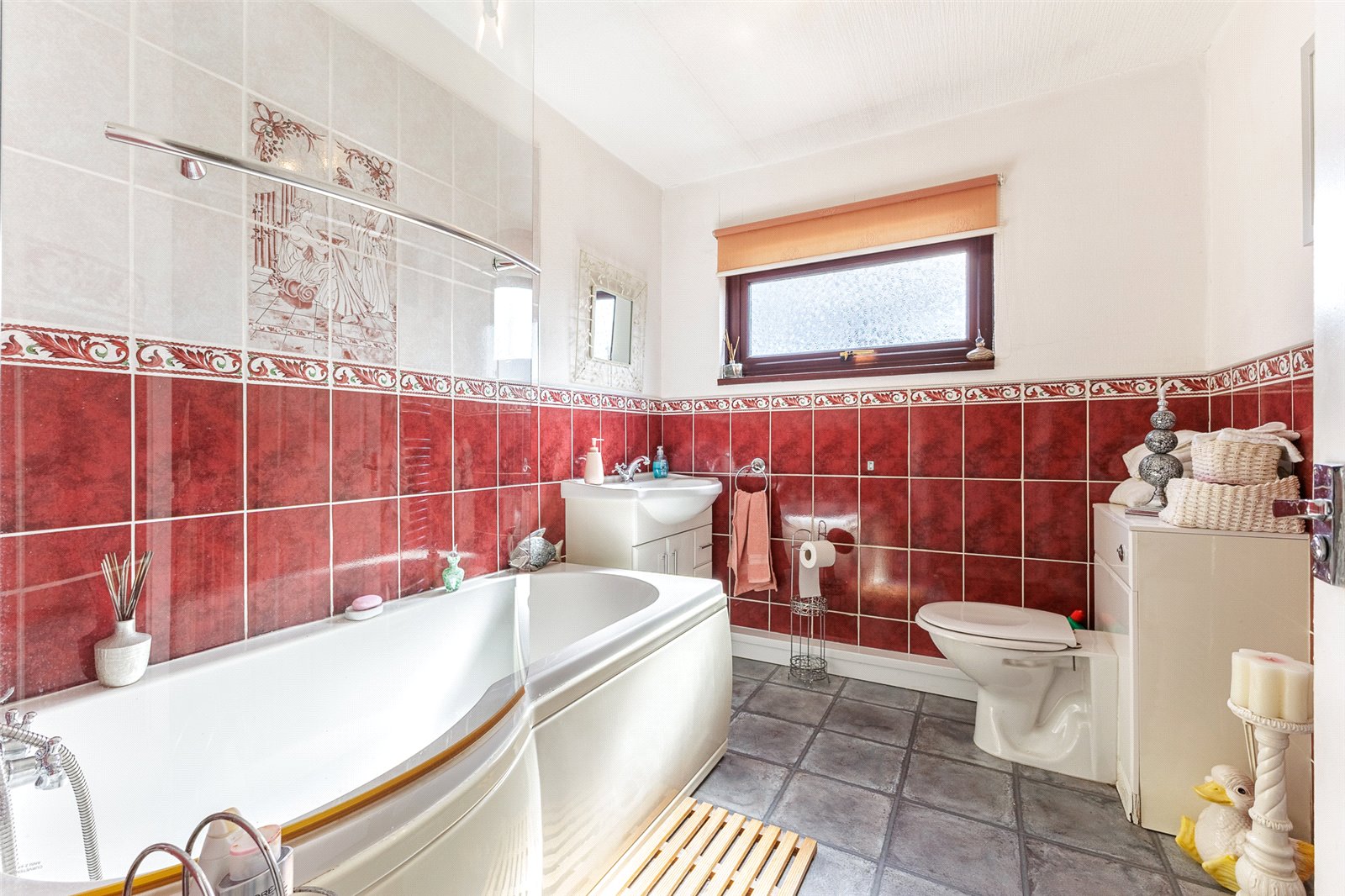 Family Bathroom Modern white suite comprising low level WC, vanity wash basin with cabinet and drawers below, P-shaped bath, shower attachment and glazed shower screen panels, chrome heated towel rail, ceramic wall tiling to wet areas.